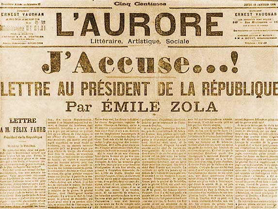 В 1896 г., когда в связи с делом Дрейфуса французская печать выступила с резкими нападками против евреев, Золя опубликовал в газете «Фигаро» статью «В защиту евреев», в которой утверждал, что поход против евреев выходит за пределы здравого смысла, истины и справедливости. Резкое выступление Золя, писателя, пользовавшегося широкой популярностью, и нееврея, сделало его главной мишенью для нападок антисемитских кругов. Однако Золя продолжал борьбу с «ненавистным и безумным» явлением, опубликовав целый ряд статей и тем подготовив поворот в общественном мнении страны. В конце 1897 г. Золя задался целью спасти «жертву религиозной нетерпимости», как он называл Дрейфуса, и 13 января 1898 г. опубликовал в газете «Орор» открытое письмо президенту Франции Ф. Фору — «Я обвиняю». В этом письме Золя обвинил французское правительство и армию в заговоре с целью сокрытия истинных фактов и в государственной измене. За оскорбление чести армии суд присяжных приговорил Золя к штрафу и заключению, и полиция должна была охранять его от разъяренной антисемитской толпы. Чтобы избежать тюремного заключения, Золя эмигрировал в Англию, где провел около года (вернулся в июле 1899 г.).