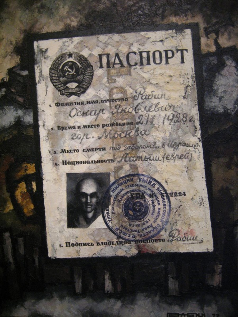 В картине «Паспорт» (1964, коллекция Н. Кропивницкой, США) трактуется тема еврейской отверженности и обособленности чужака: на фоне пейзажа воспроизведена огромная страница из паспорта художника, где в графе «национальность» написано — «латыш (еврей)».